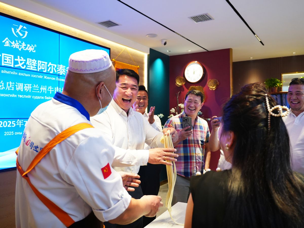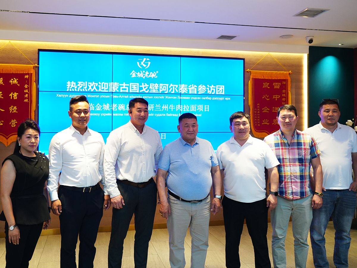 2025 年 7 月 5 日,蒙古国戈壁阿尔泰省参访团一行莅临金城老碗总店大众巷店,对兰州牛肉拉面项目展开专题调研,深入感受中华美食文化魅力,探寻产业合作新机遇。