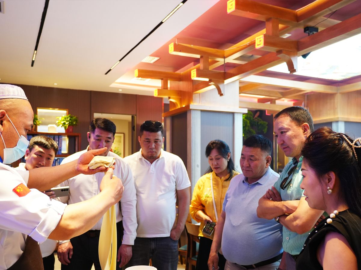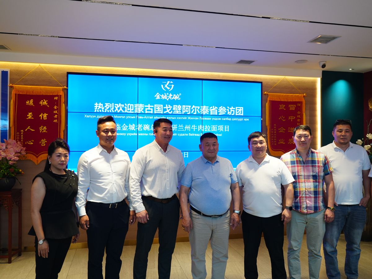 2025 年 7 月 5 日,蒙古国戈壁阿尔泰省参访团一行莅临金城老碗总店大众巷店,对兰州牛肉拉面项目展开专题调研,深入感受中华美食文化魅力,探寻产业合作新机遇。